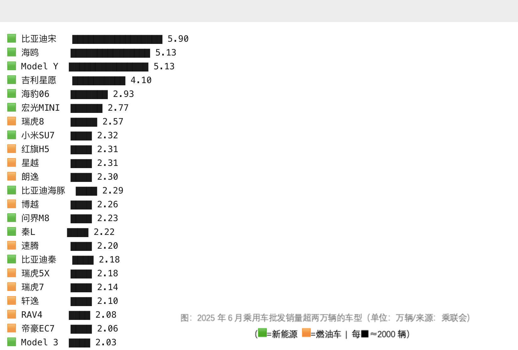 但到了2025年6月,這一數字擴大至23款,新能源依舊強勢,但、、瑞虎7、星越、速騰等一眾燃油老將重新出現在前列。