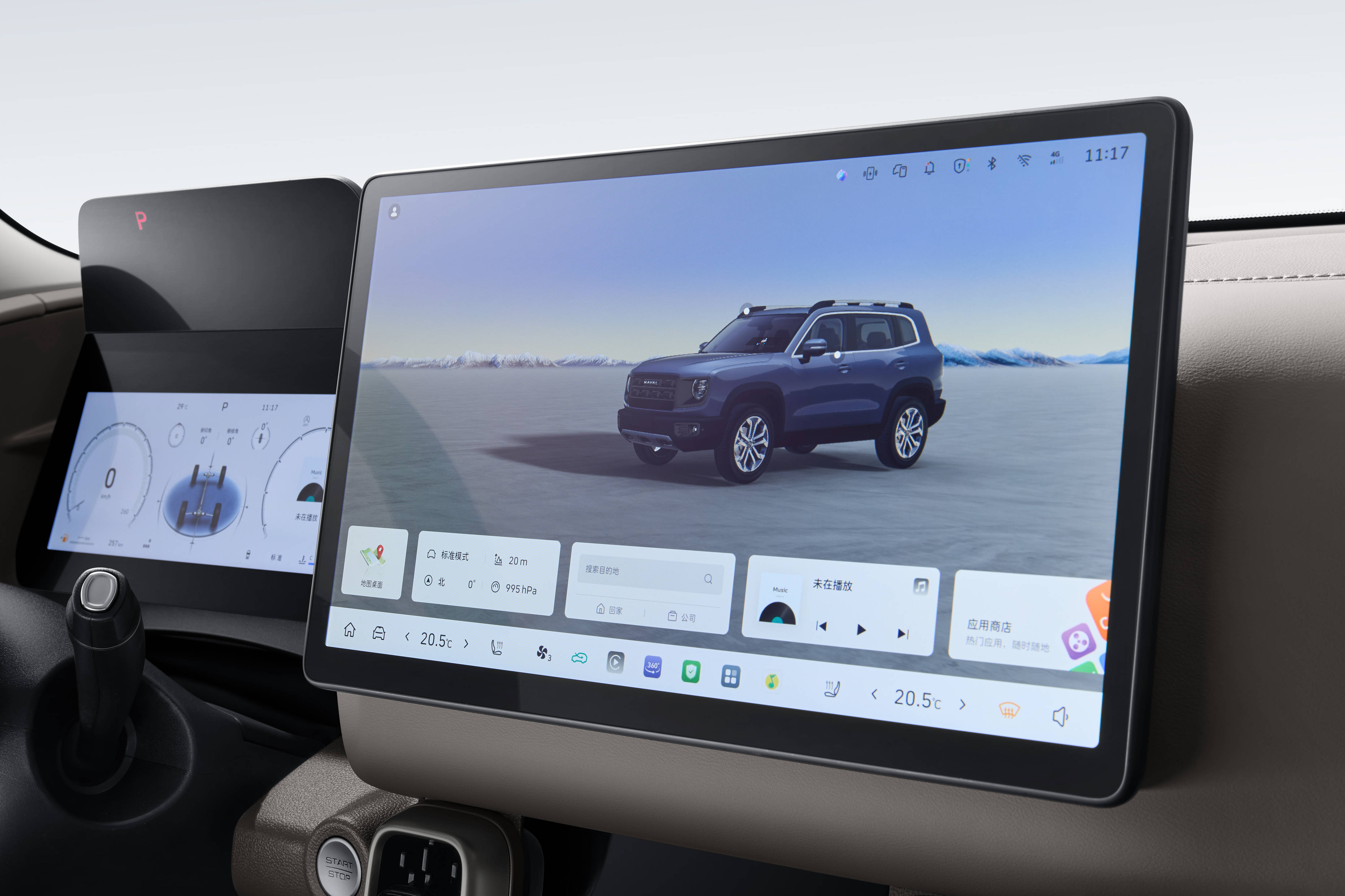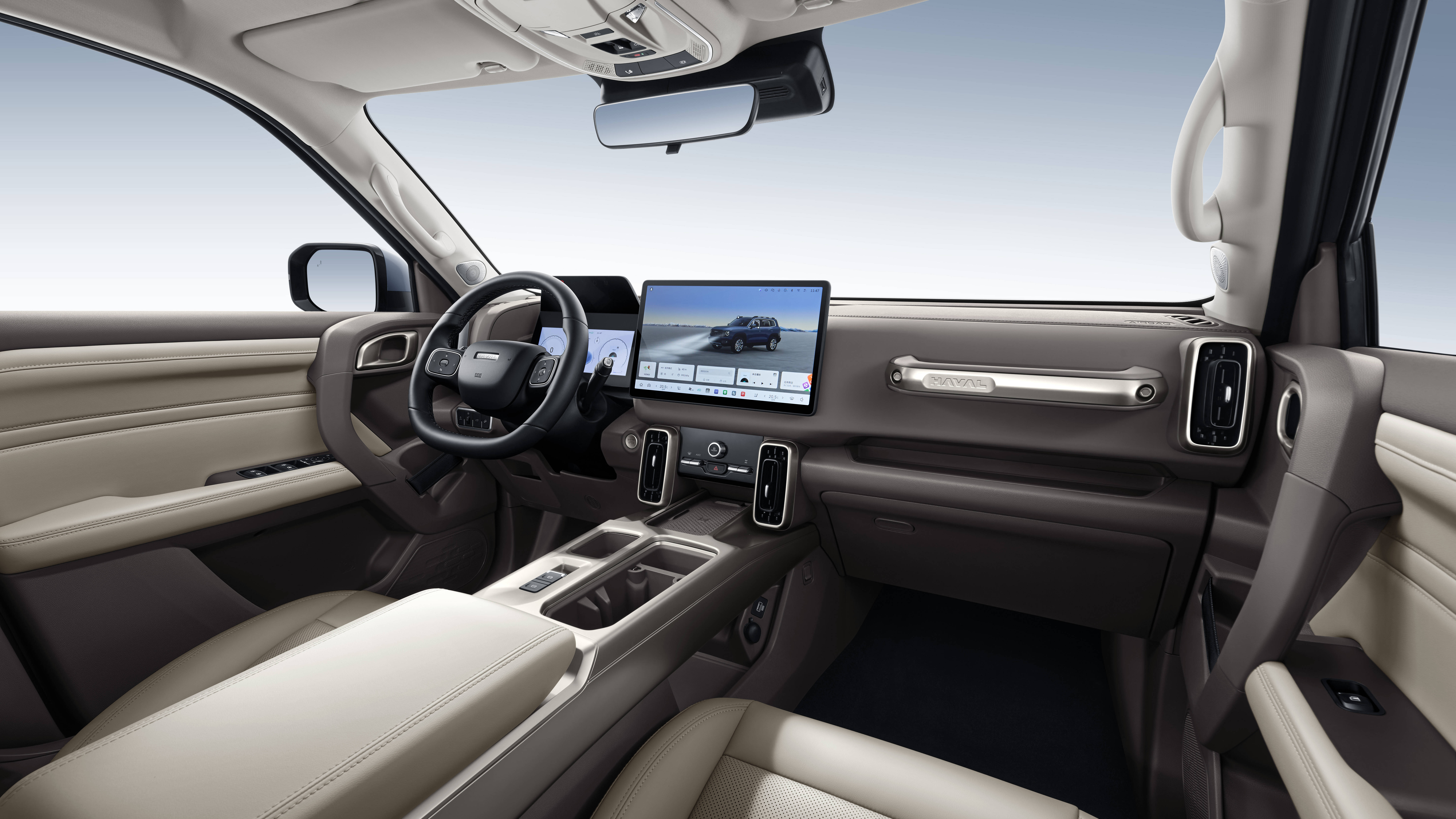 內飾進來,10.25英寸全彩數字虛擬組合儀表,14.6英寸中控屏,咖啡OS智能座艙,支持語音控制,L2加輔助駕駛,540度全景影像,透明底盤在越野的時候很有用,平時過個宅門,碎石路,也能有個參考。車頂行李架放上帳篷,帶上你的露營設備,拉個天幕圍著車,鍋碗瓢盆一擺,就是個營地了。