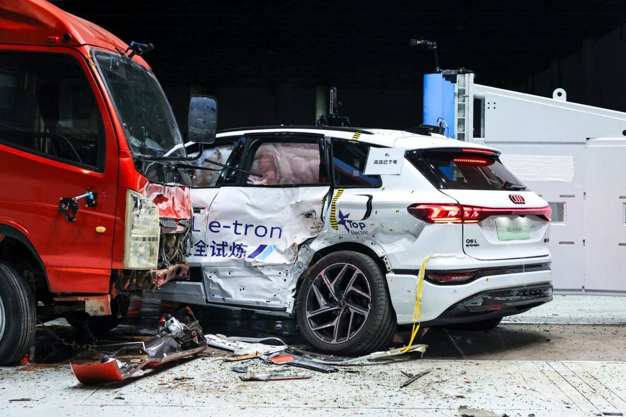 但是緊接著,一輛重達3噸(模擬城市常見物流貨車重量)的失控貨車,以50km/h的速度從側面垂直方向撞向Q6L e-tron左側車身第二排區域。巨大的撞擊力瞬間使得車輛發生旋轉,右側第二排位置與剛性柱體(模擬路側堅固的燈桿)發生碰撞,形成難度極高的“貨車側撞+固定柱體夾擊”的連環碰撞測試。