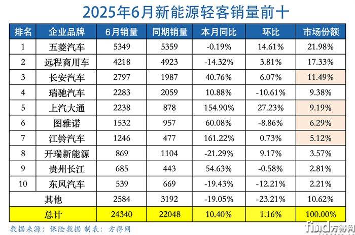 新能源輕客(車長4.5米~7米,以VAN類封閉式廂式物流車為主)2025年6月銷量24340輛,同比上漲10.40%、環(huán)比小增1.16%!