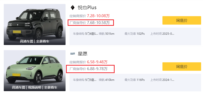 售價方面,寶駿悅也Plus的廠商指導價為7.68-10.58萬元,301km、401km、501km三種續航里程,吉利星愿廠商指導價為6.88-9.78萬元,提供了310km、410km兩種續航里程。