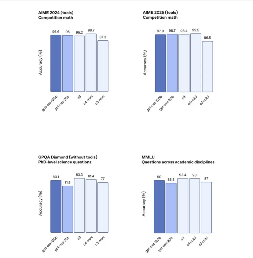 gpt-oss-120b模型在核心推理基準測試中實現(xiàn)了與 OpenAI o4-mini 接近的性能,可以在單張80 GB GPU 上高效運行。gpt-oss-20b 在常見基準測試中能達到與 OpenAI o3-mini 類似的性能,可以在僅具有 16 GB 內(nèi)存的端側(cè)運行。