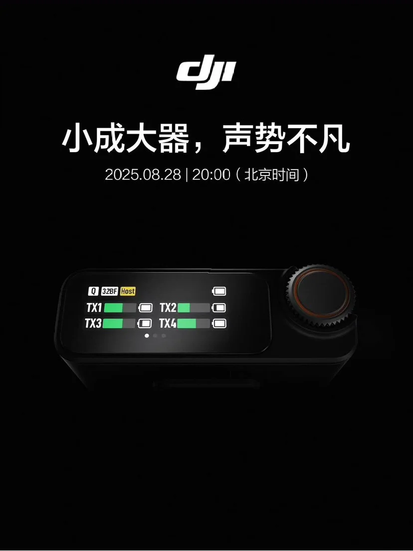 8 月 21 日消息,大疆今日官宣,將于 8 月 28 日 20:00 發布一款新品。從預熱視頻來看,預計是一款麥克風產品。