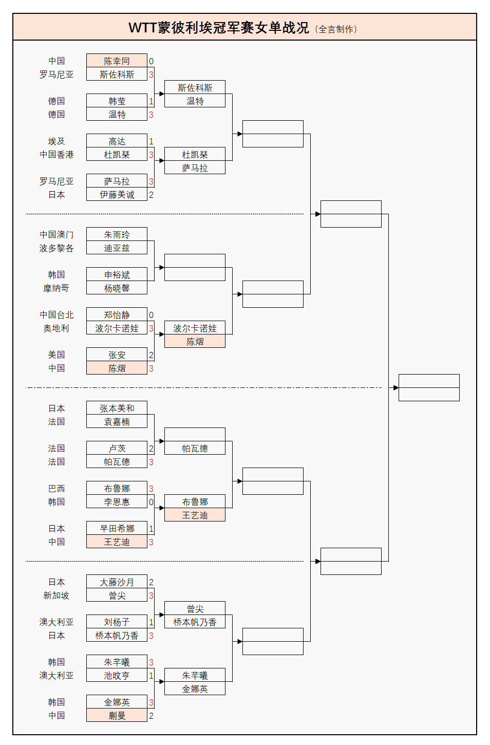至于國(guó)乒男單3人目前已經(jīng)全軍覆沒,女單也有2人被淘汰,全隊(duì)僅剩王藝迪、陳熠2人繼續(xù)前進(jìn),的確競(jìng)爭(zhēng)激烈——以下為兩項(xiàng)單打的最新進(jìn)展: