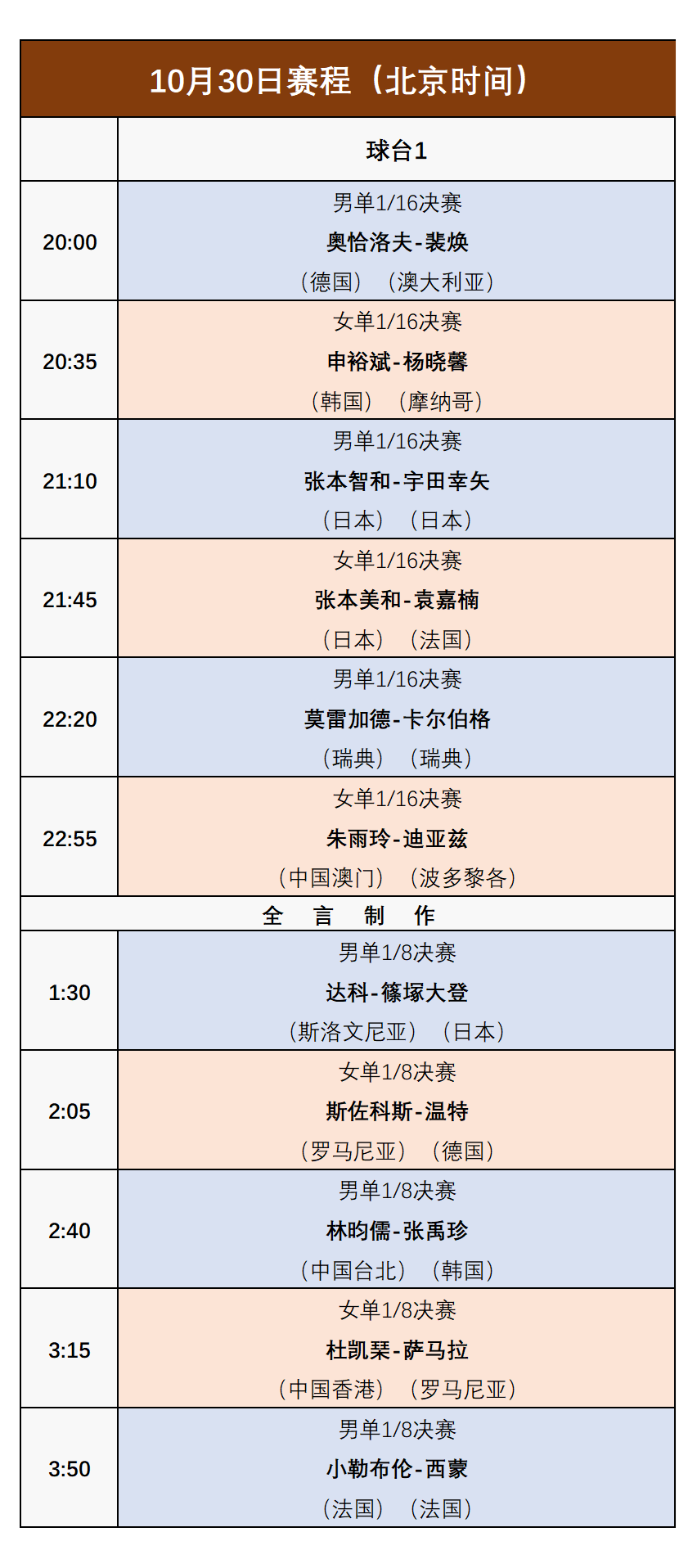 根據(jù)安排,10月30日晚將結(jié)束單打首輪的最后6場(chǎng)1/16決賽,不過(guò)沒有國(guó)乒運(yùn)動(dòng)員參加,詳細(xì)賽程如下: