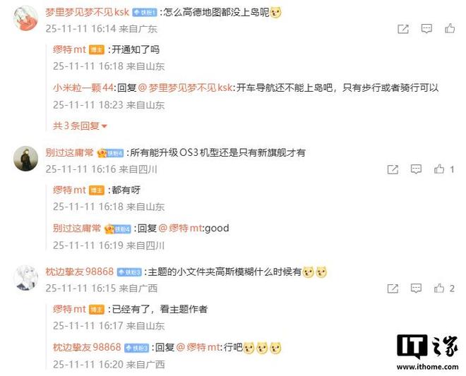 博主還在評論區(qū)回復(fù)了部分網(wǎng)友的問題:針對新動畫是所有能升級 OS 3 機(jī)型都有,還是只有新旗艦才有,博主回復(fù)稱:“都有呀。”針對主題的小文件夾高斯模糊什么時候有,博主表示:“已經(jīng)有了,看主題作者。”
