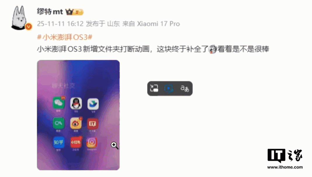11 月 11 日消息,博主 @繆特mt 今日分享,稱小米澎湃 OS 3 系統(tǒng)新增了文件夾打斷動畫